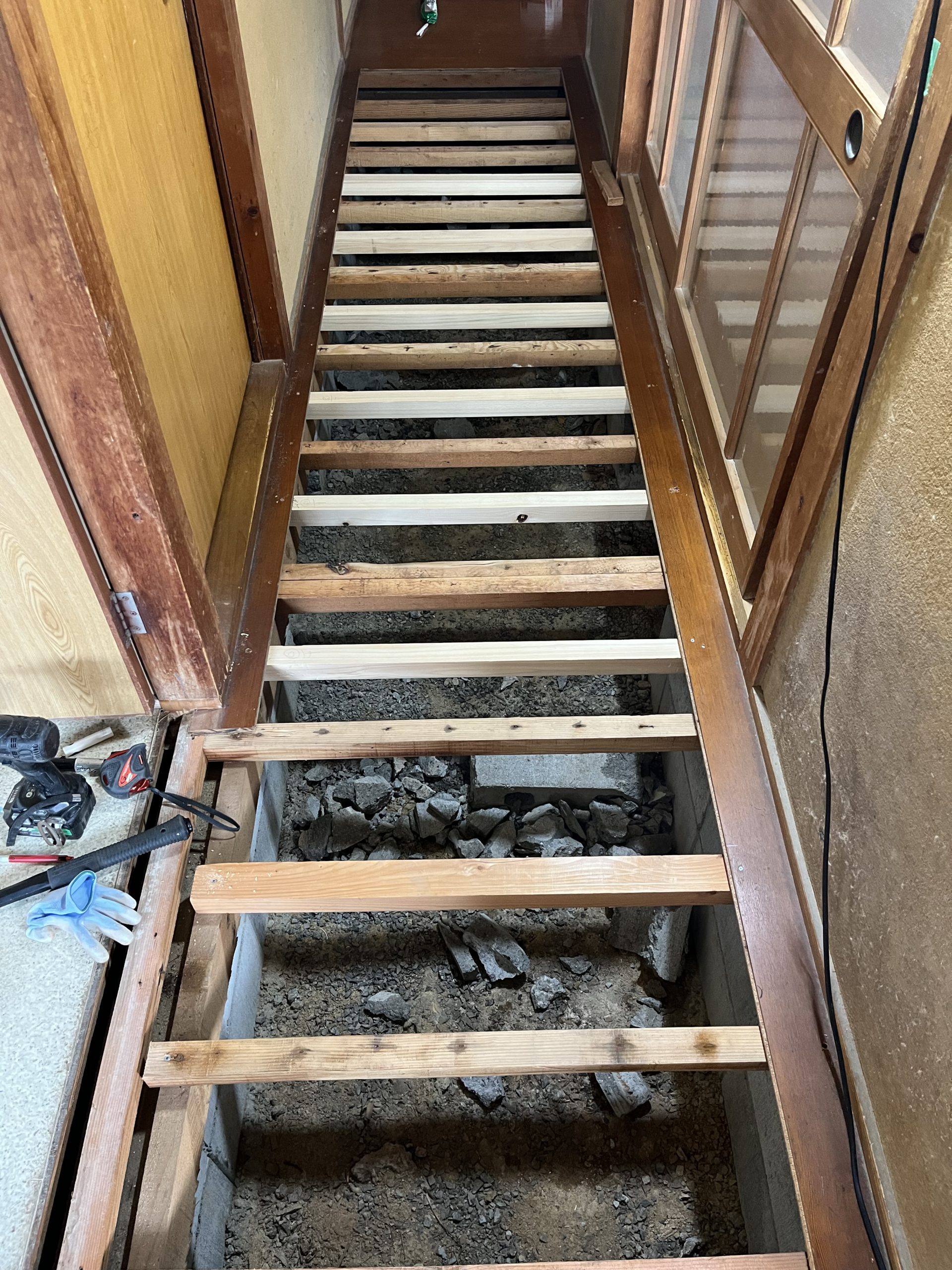 部分的に解体や補強を入れ、床の強度を上げていきます。 お風呂場の入り口は土台から腐っていたので、やり直しです。 予定より痛んでいましたが、何とか予定通り納めることができました✨