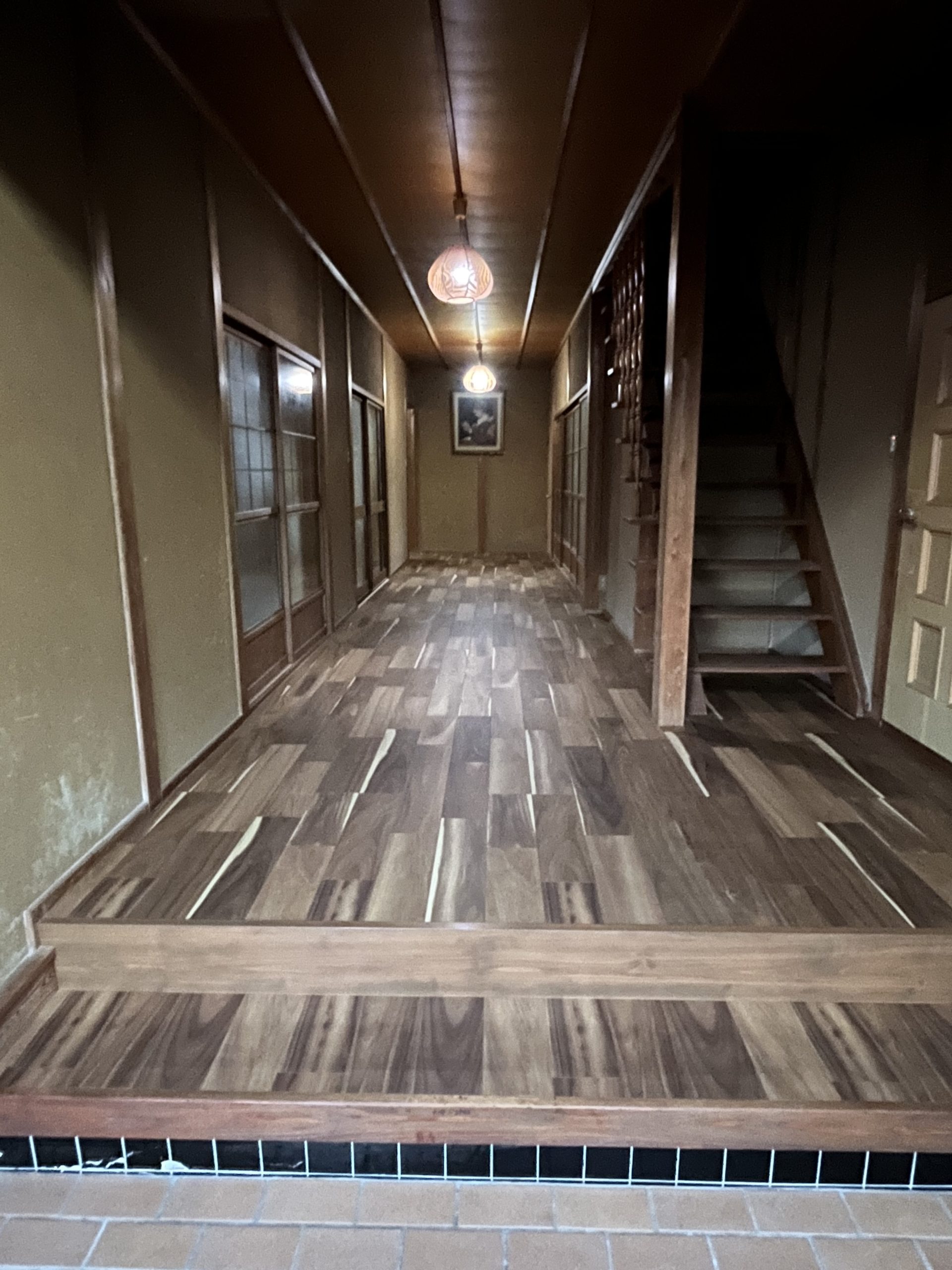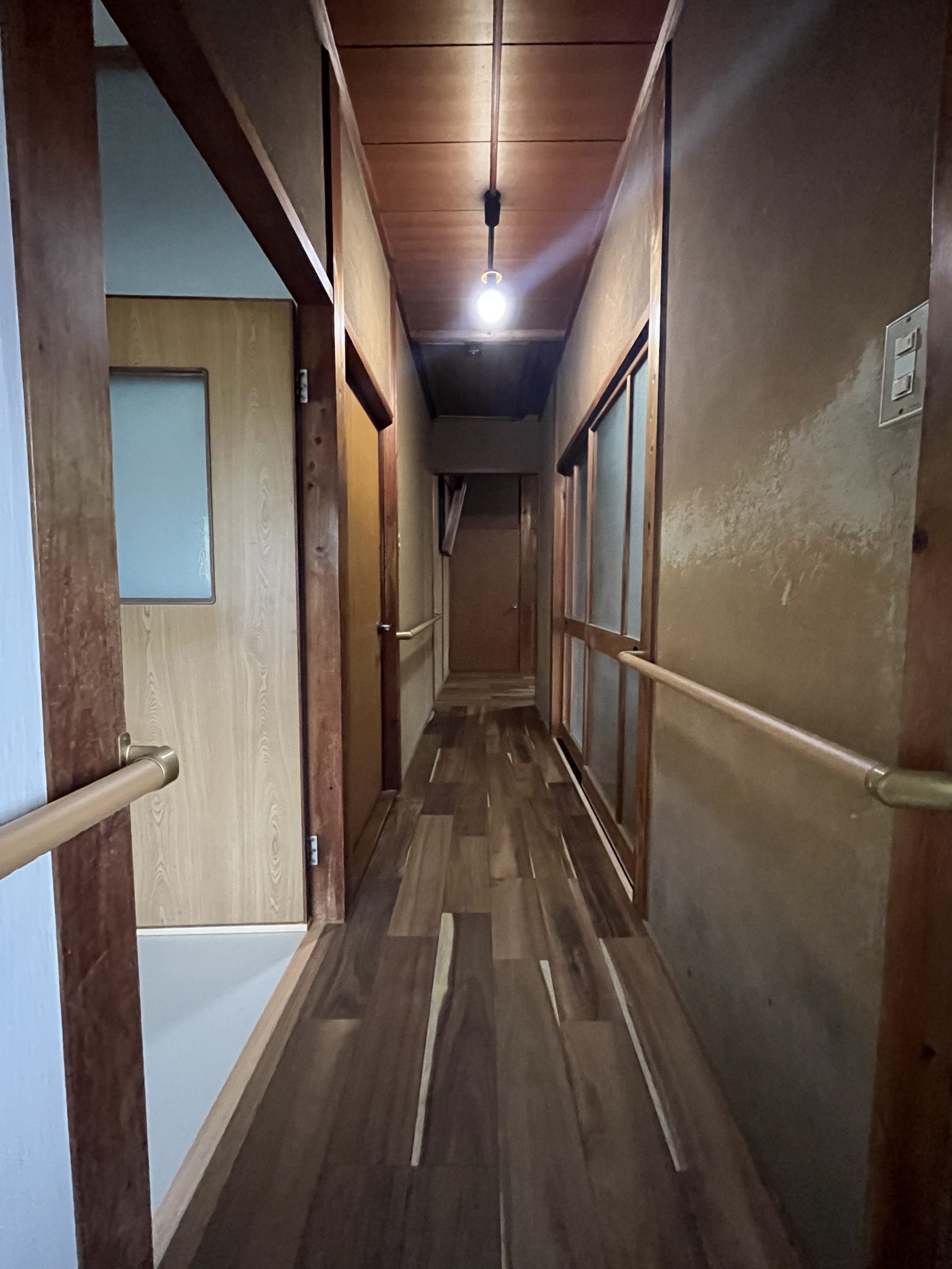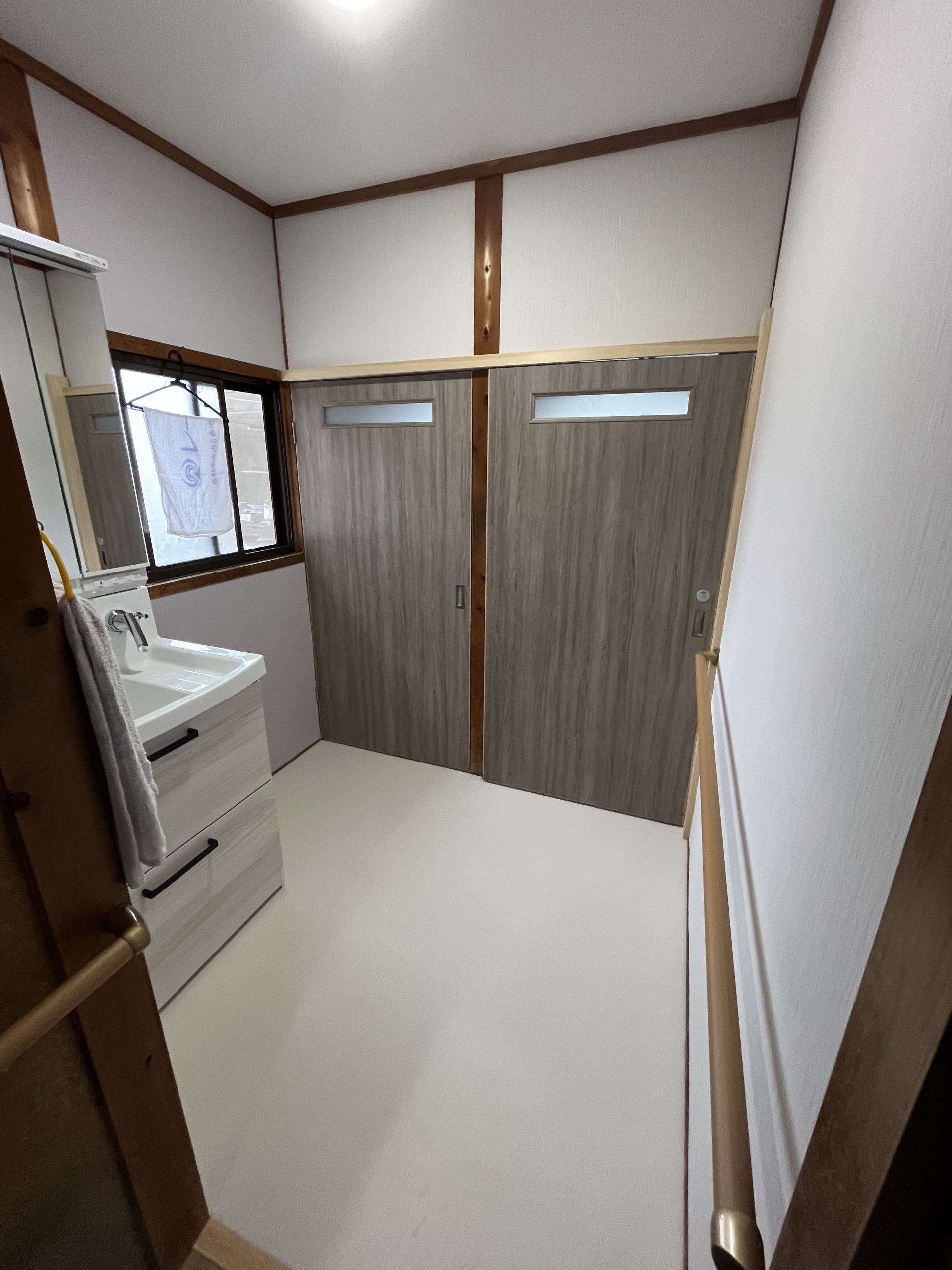 約2週間にわたる工事が完成しました。 廊下のフローリング重ね貼り 洗面、脱衣場の床やりかえ 綿壁をクロス仕様に 洗面台を新品に 補助金で手すり取付 全体的に床が悪く、白アリ被害もあったので白アリ駆除をしてからの工事となりました。