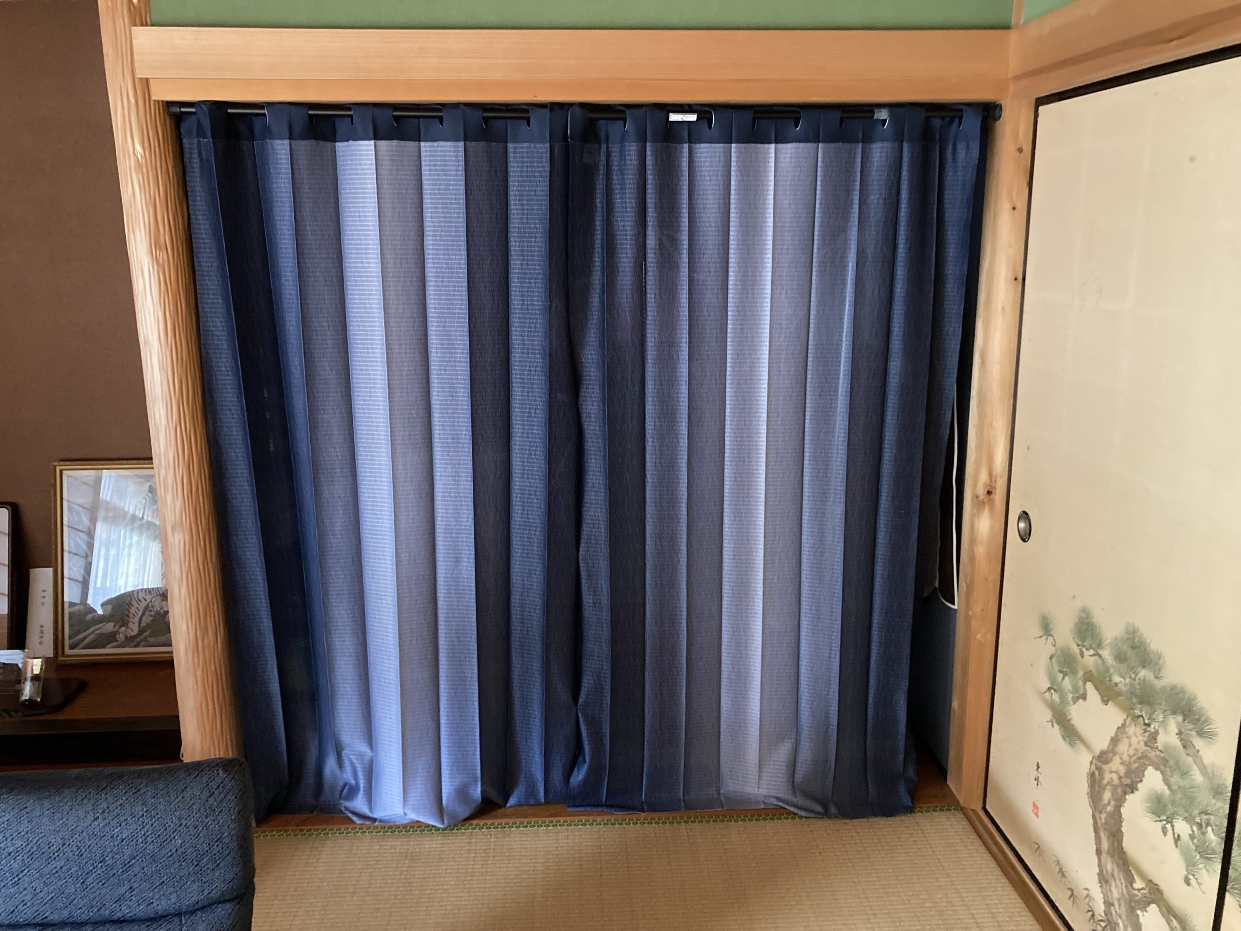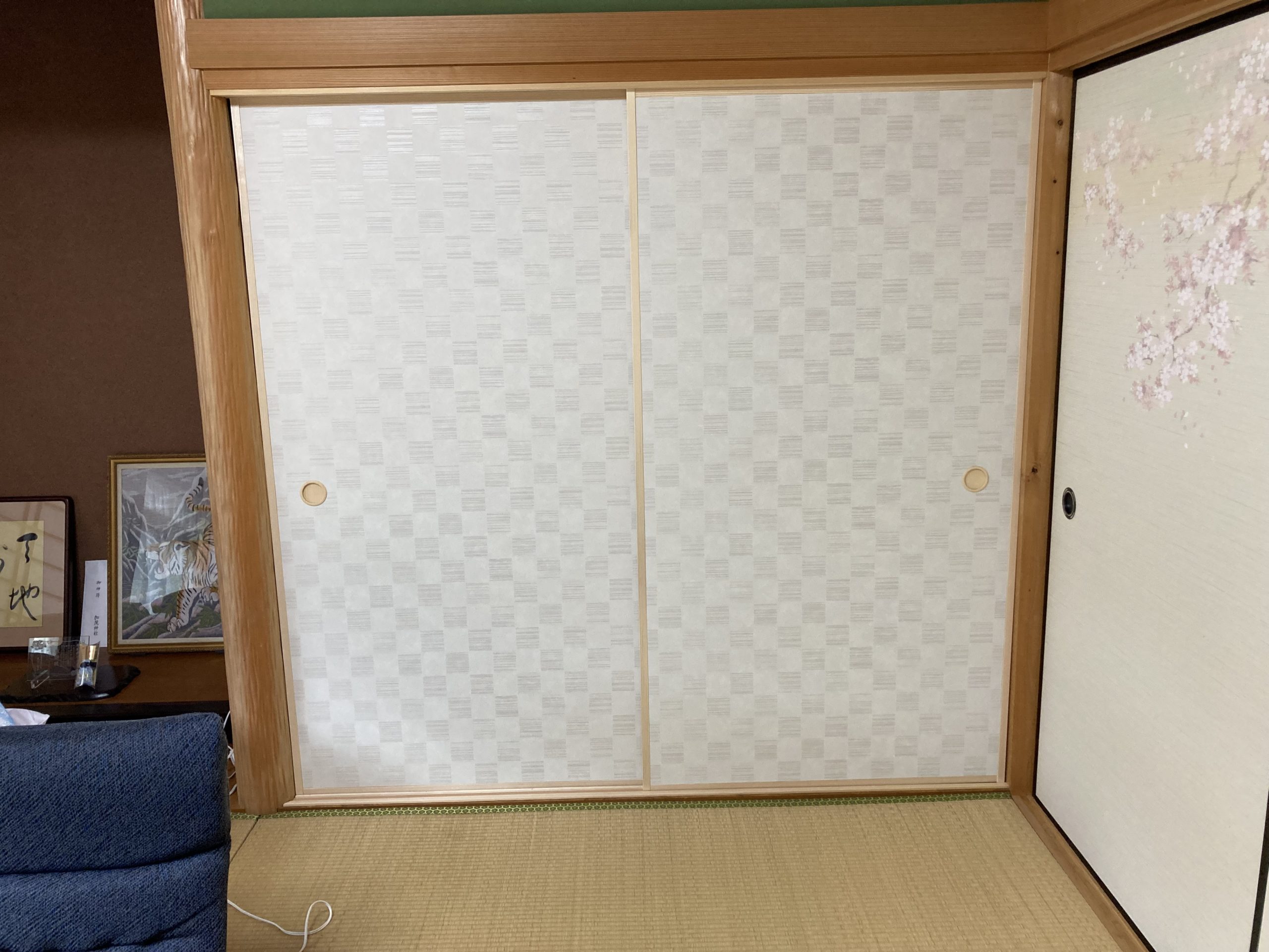 襖の貼り替えです。 上から桜が降りてくる柄で、お客様も満足していただけて良かったです。 こちらは床の間を押入れとして使いたいと、ご相談いただきました。 襖の枠もなかったので、枠の施工を行ってから新調の襖を入れています。