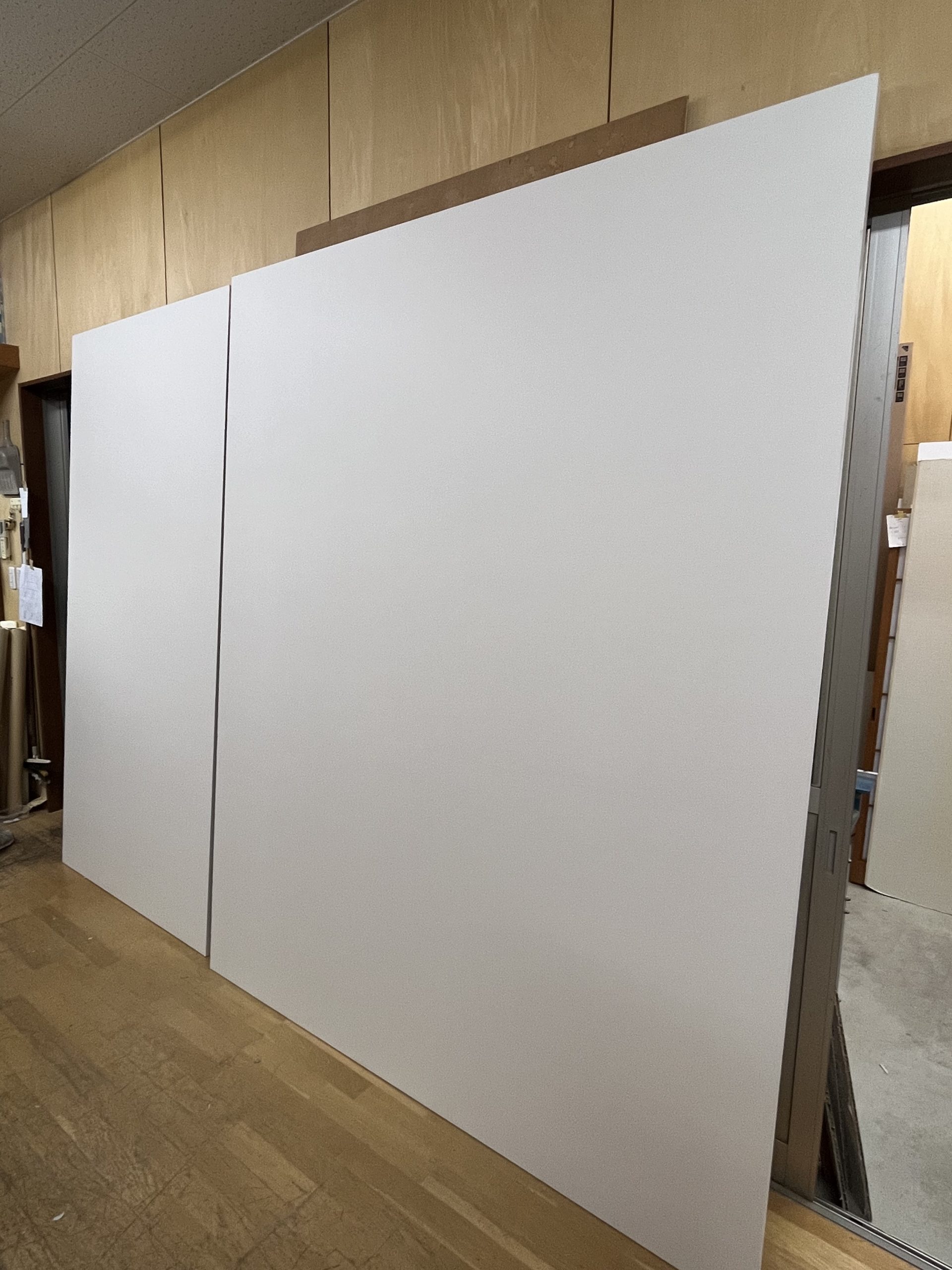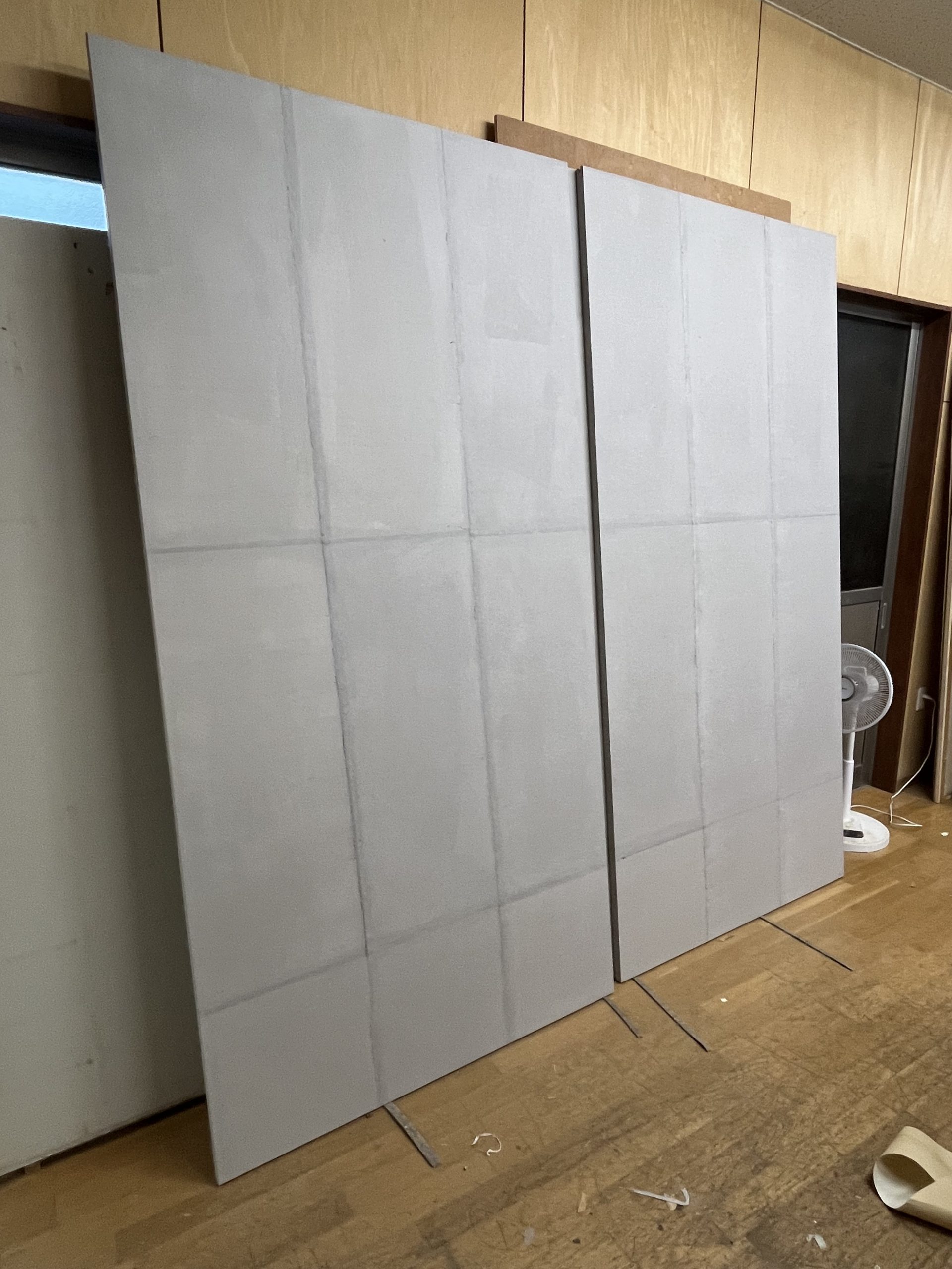 某木工屋さんのご依頼で、津山産の伝統和紙【横野和紙】を施工させていただきました。   なんと!2.4mもある襖です!   骨組みの状態から下地の白い和紙を貼り、グレー色の横野和紙で仕上げております。